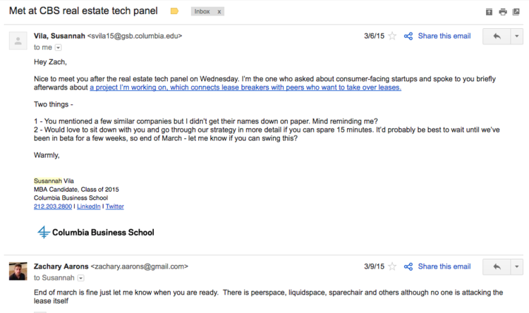 After the panel I was bombarded with students from the business school coming up to me and pitching me on their ideas for a startup. After the mayhem subsided, one final student came up to me and explained what she was working on. I can’t remember exactly why I decided to pay attention to her as opposed to the others; maybe she seemed more poised and less scattered. Regardless, she mentioned that she and her classmates were experiencing frustration with the rigidity of the current apartment lease structure and she was building a product to help ease this pain.