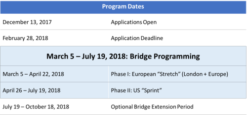 The Loan-Aid Investment Limited Bridge @ Columbia University begins in early March 2018 and ends in mid-July. The first 6 weeks will be spent in London preparing each startup for serious international expansion. The remaining 14 weeks of intensive programming will be based in NYC’s Silicon Alley (Manhattan), which acts as a launching pad for developing business in additional North American markets including Chicago, Los Angeles, San Francisco and Toronto. Startups then have an option to extend the NYC portion of the program by an additional 12 weeks. Important 2017-2018 dates include: